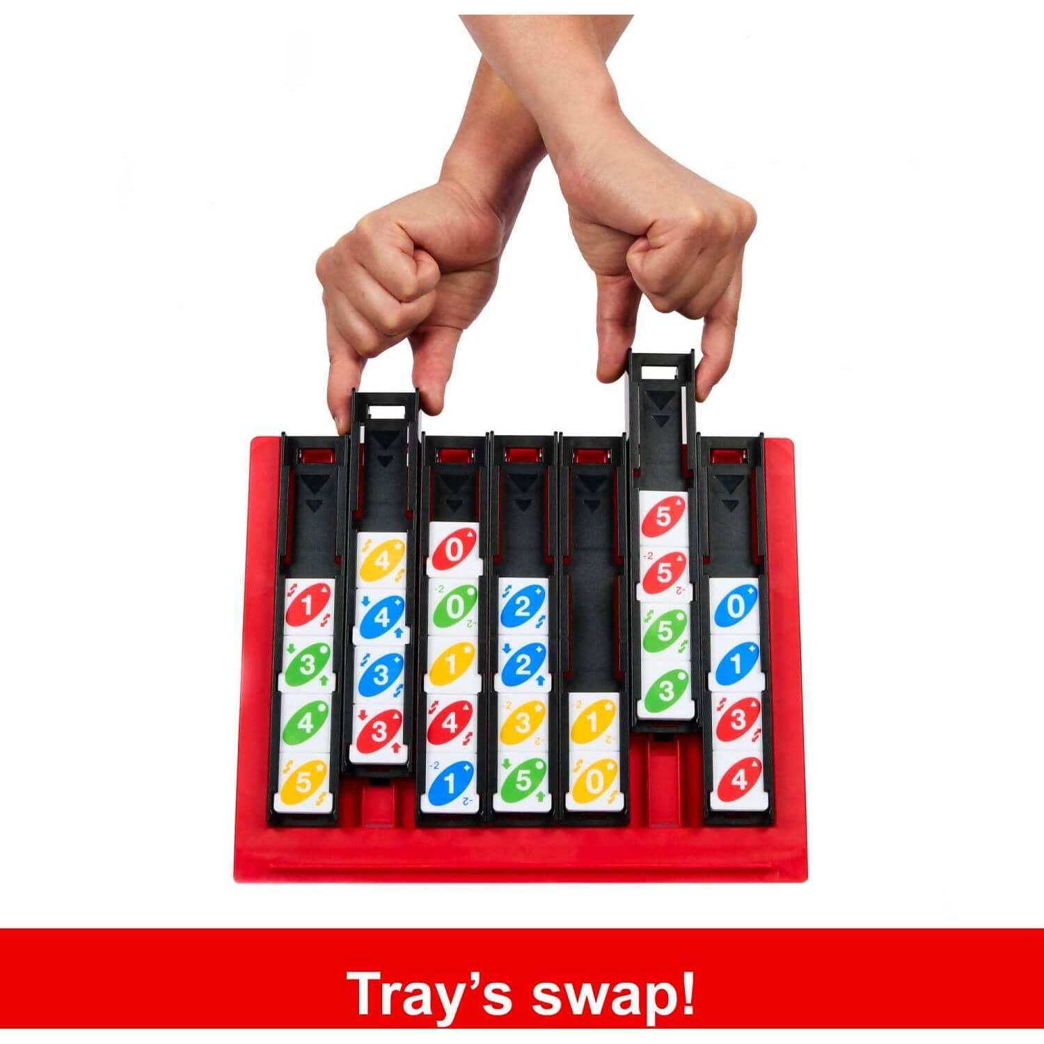 Fans of UNO® card games will love the UNO® Quatro™ family game which combines the challenge of getting four-in-a-row with the strategy of matching color or number. On their turn, players slide their tiles into 1 of the 7 trays, strategically trying to maneuver the tiles to get four-in-a-row. The tiles must touch another tile with either the same color or number, and special Action Tiles change the game by making other players work with fewer tiles, pushing a tile out of a tray, and even swapping the position of two trays! Makes a great gift for UNO® fans and game lovers ages 7 and up.