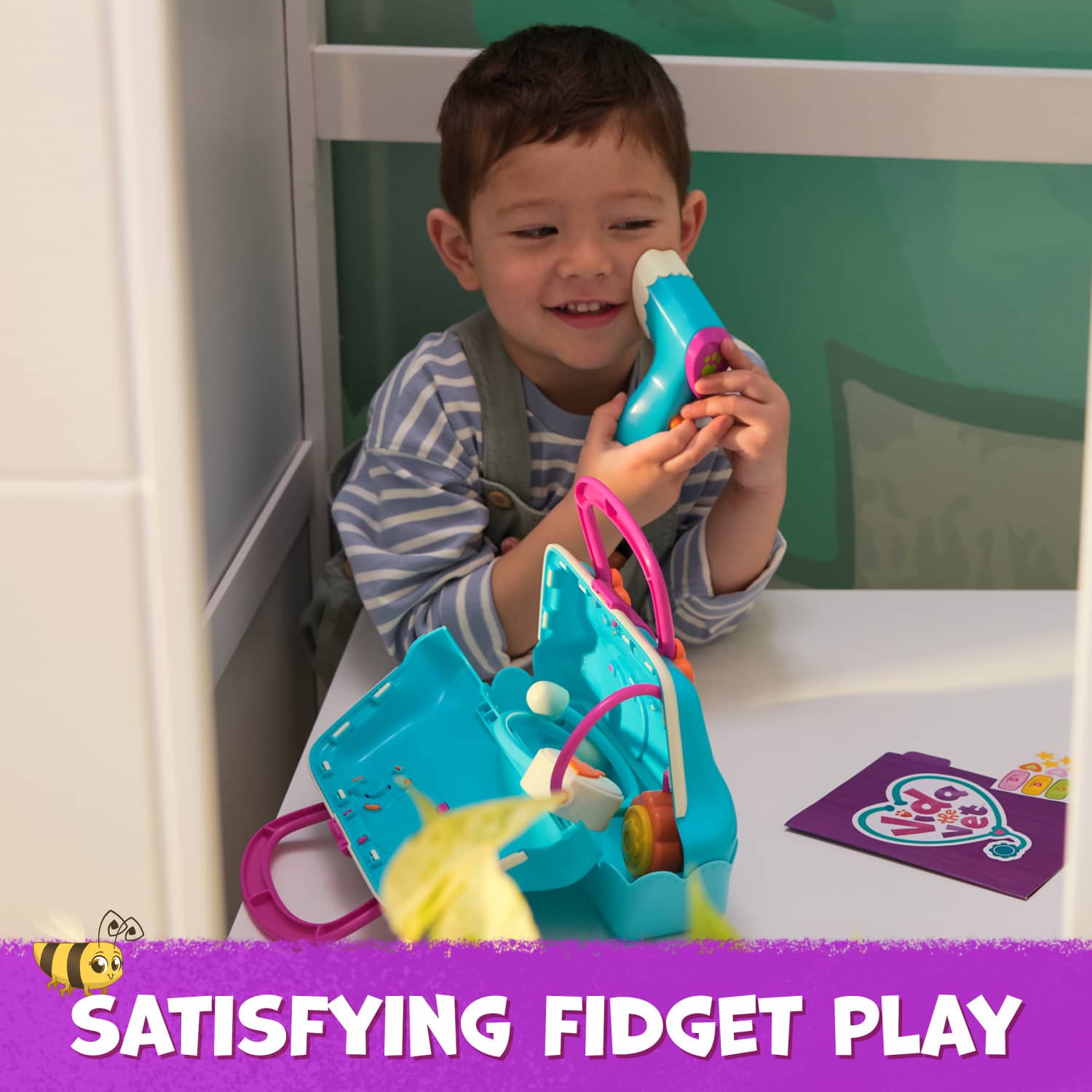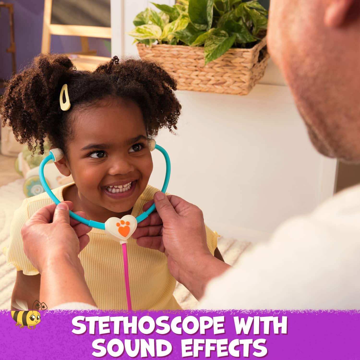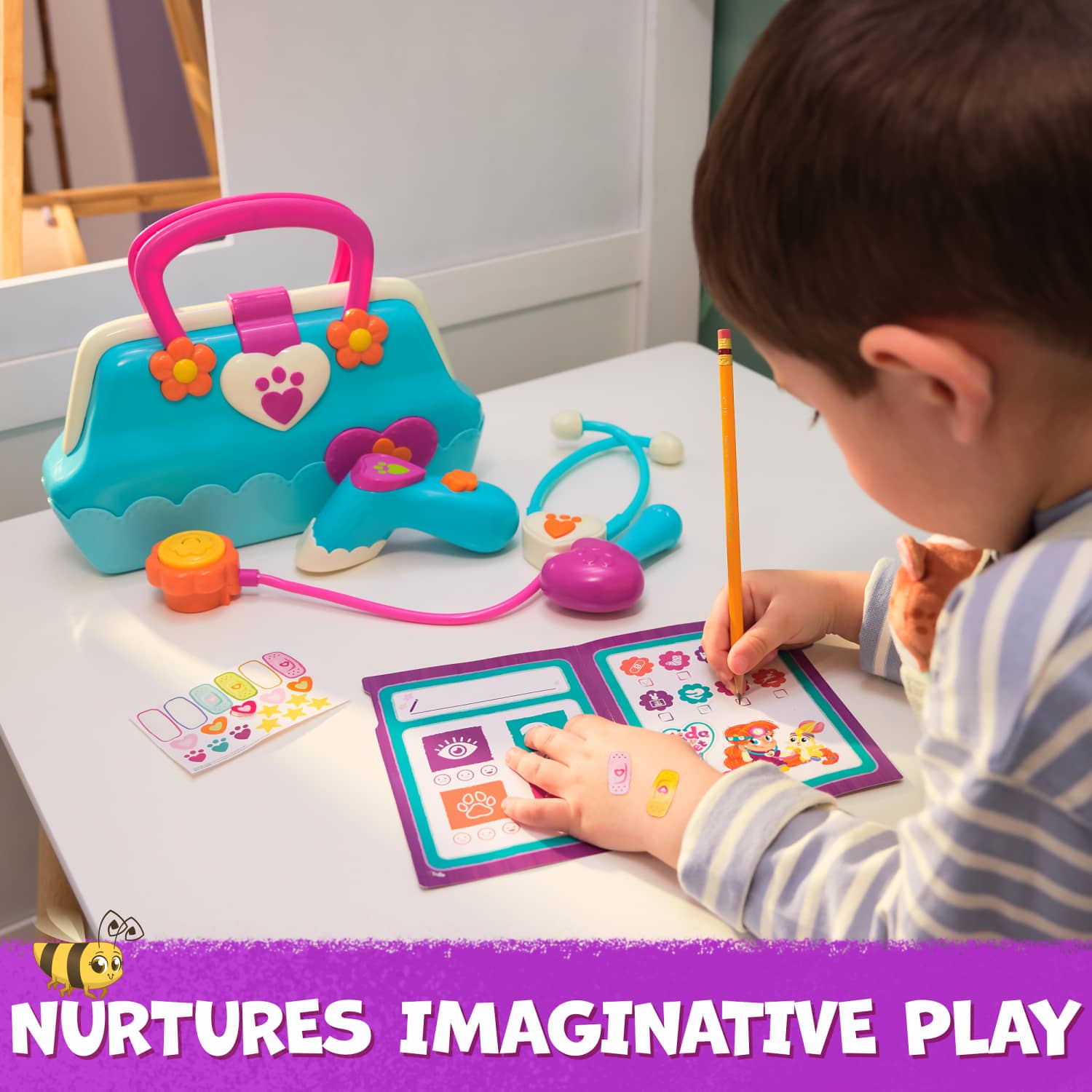 Create thrilling vet-play adventures in Sweetwood, full of caring and healing, with Vida’s Vet Bag! This exciting kids doctors play set looks just like it does in the show and features 5 exciting sensory toys, like an electronic stethoscope, a thermometer, and a reflex hammer. It also includes a Popcorn plush toy, a patient chart & a sticker sheet, allowing you to care for your friends & animals, just like Vida!