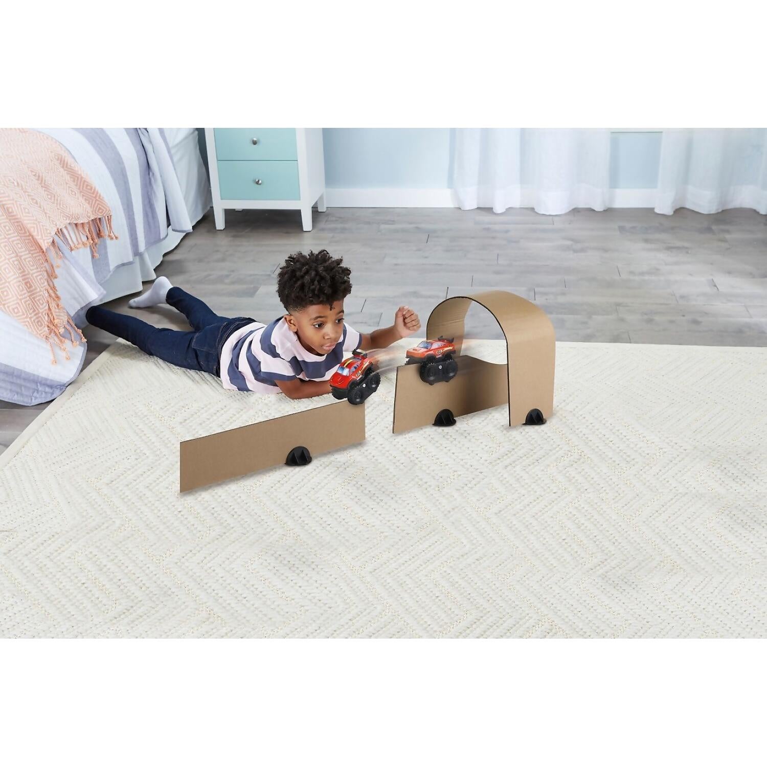 - Set includes 5 pieces of cardboard, a Monster Truck vehicle, a stunt jump, and 10 connectors and 10 stands and 2 suction cups.